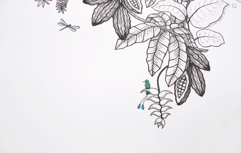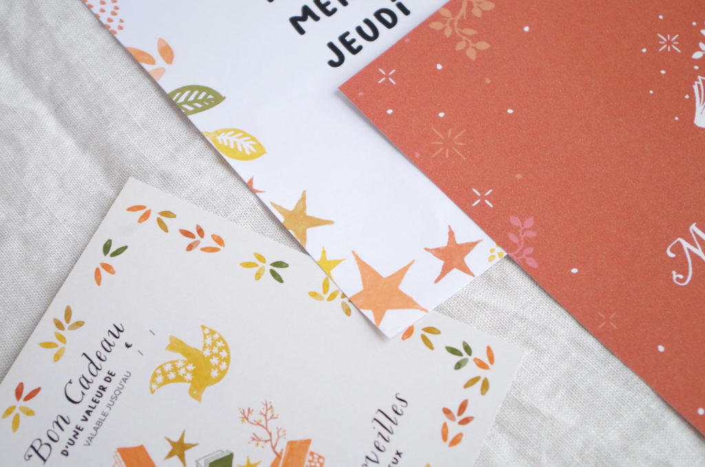Pour égayer la carte-cadeau et le modèle d'affiche, des illustrations colorées qui illustrent l'univers enchanté de la librairie ont été créées, elles-aussi peintes à la main à l'encre.
