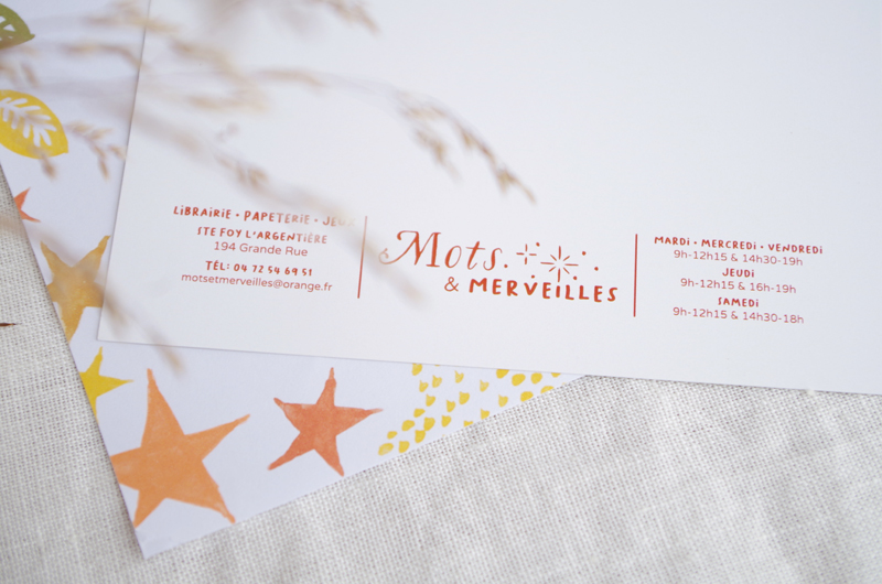 11 ans après la création de la librairie Mots et Merveilles, Élise Chaverot a souhaité faire appel à mes services pour donner une apparence plus professionnelle à sa librairie. Pour cela, j'ai créé un univers visuel global qui a été décliné sur ses cartes de visite, sa carte-cadeau, un modèle d'affiche pour les événements qu'elle organise régulièrement dans sa boutique, ainsi que ses nouvelles enseignes extérieures.