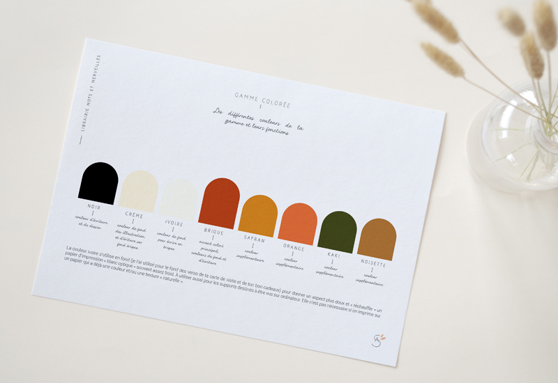 L'identité visuelle livrée à Élise contient une charte graphique qui permet de recréer de nouveaux éléments en toute cohérence avec l'univers crée par mes soins. En voici quelques extraits qui expliquent comment associer les différentes typographies sélectionnées pour la librairie et comment utiliser les couleurs de sa gamme.